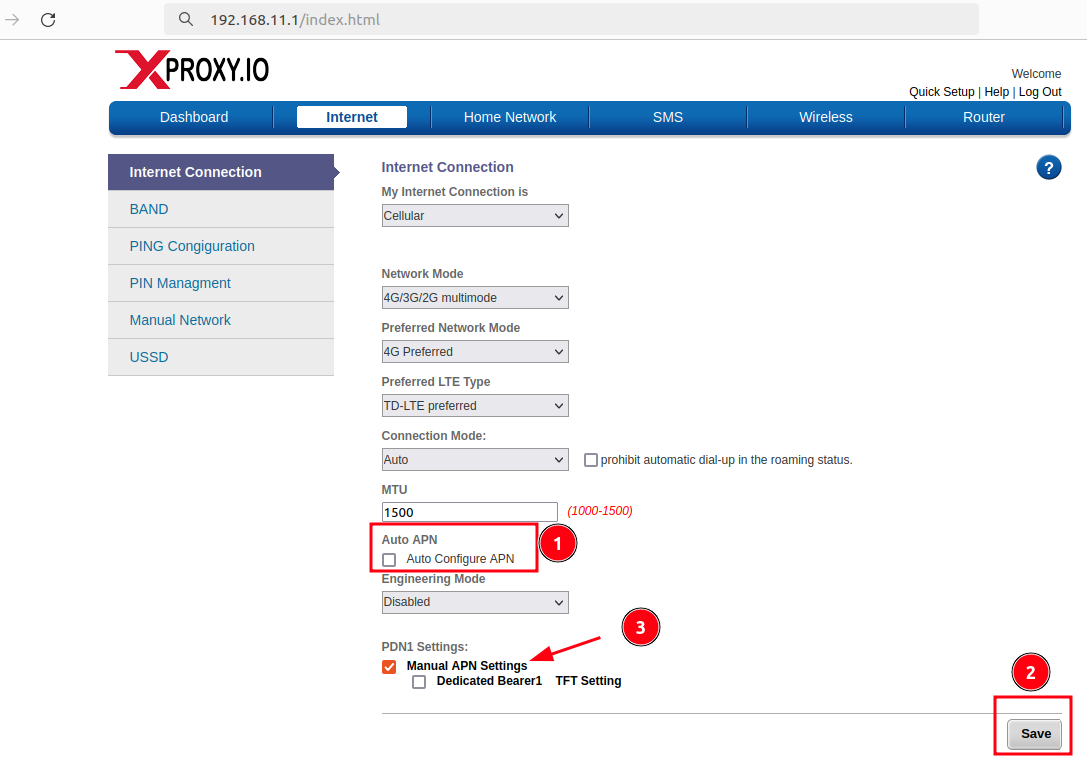 Go internet Menu -> Disable Auto Configure APN (1) -> Save (2)