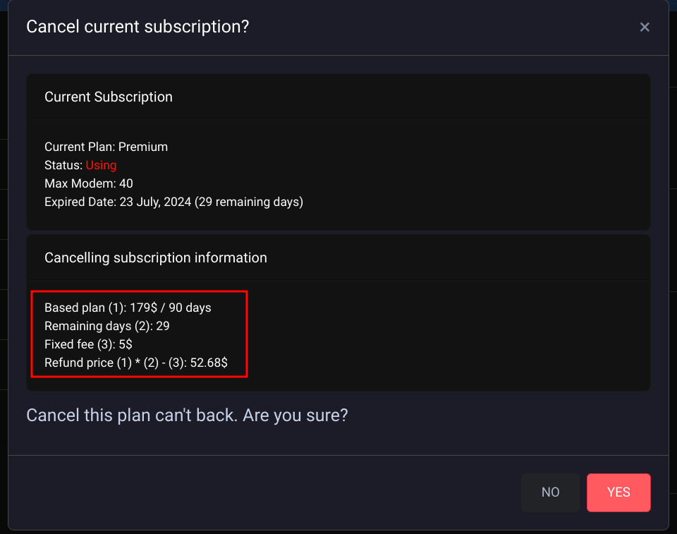 - Click Cancel Subscription on your current subscription, the system will notice you the funds be refunded.