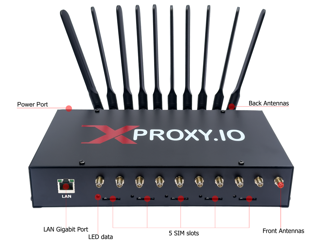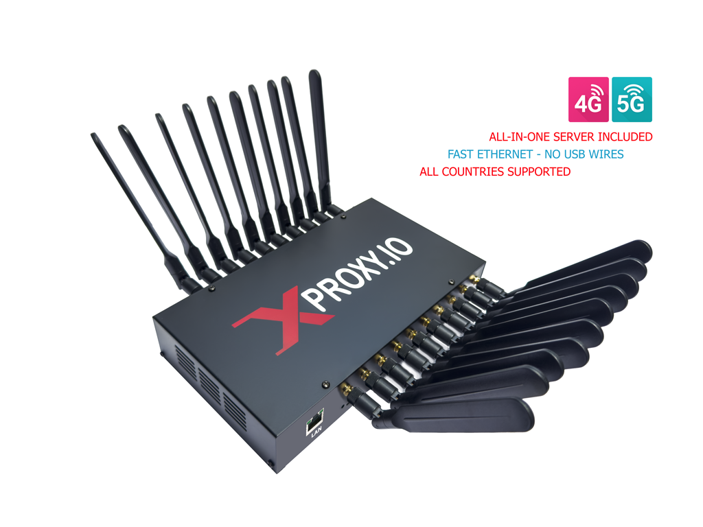 The XLE5 is a next-generation all-in-one 4G/5G mobile proxy device designed for professionals and businesses that need the highest standards of stability, speed, and scalability. Featuring up to 5 modems with 20 antennas (5G version), 10 antennas (4G version), 5 standard SIM slots, and an integrated server, XLE5 makes deploying mobile proxies easy and reliable.